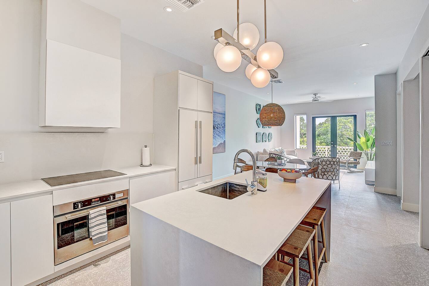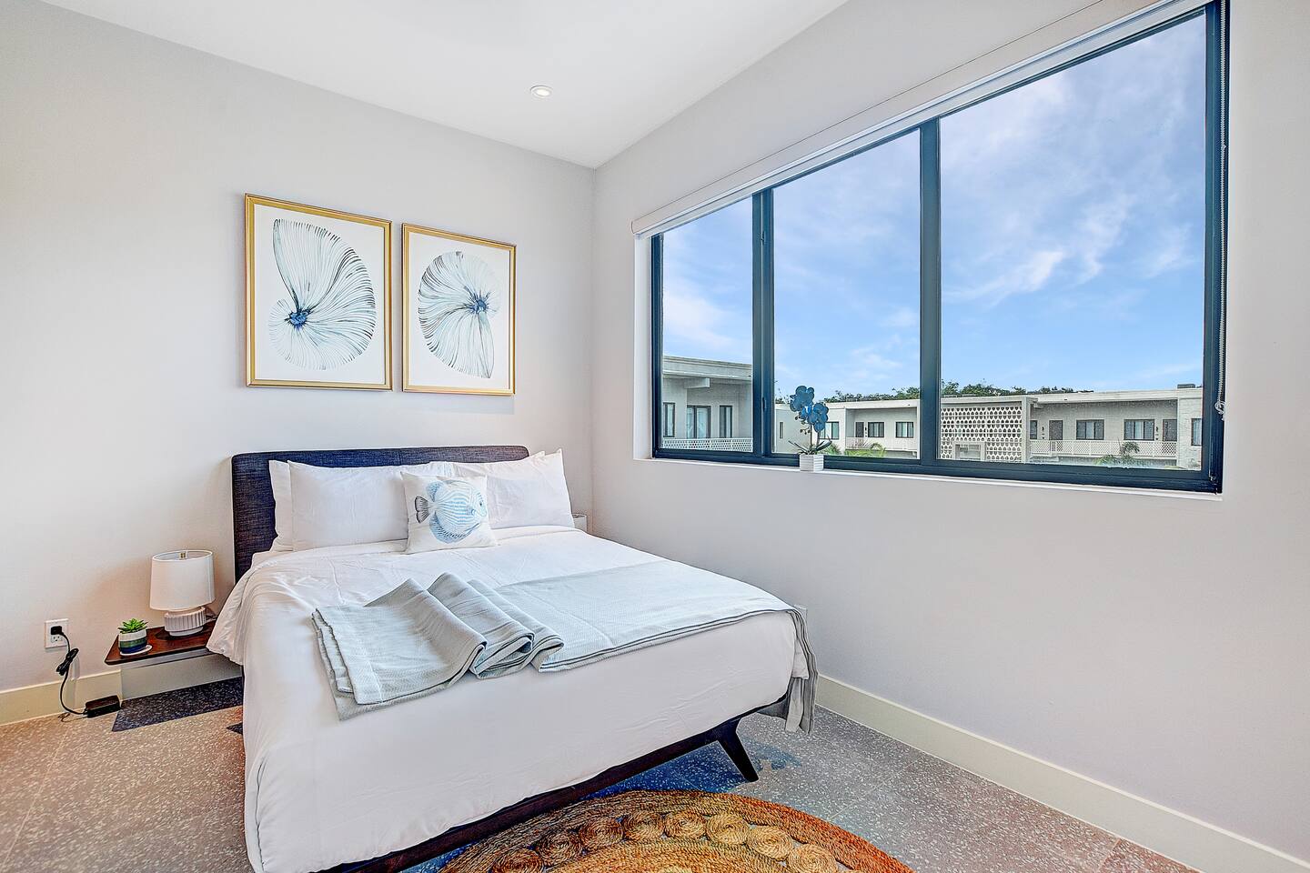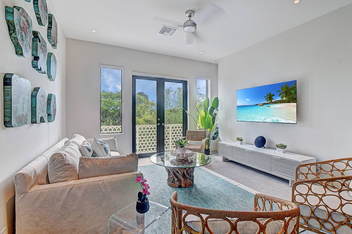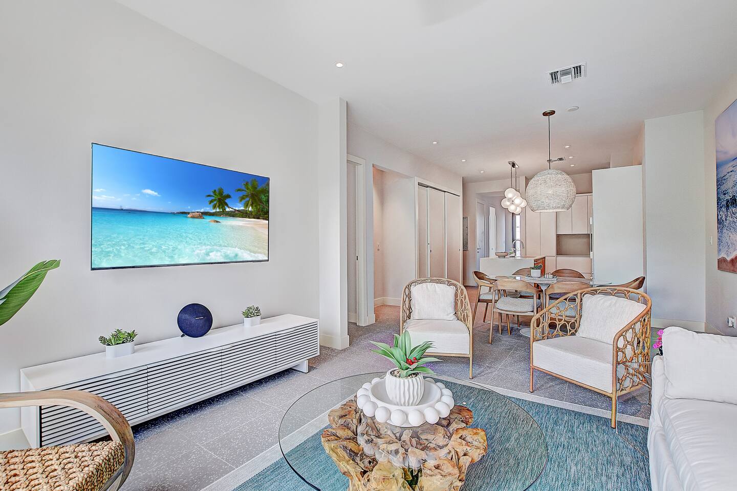 Experience the essence of island living in this modern tropical retreat. Unwind in open, sunlit spaces or on the private balcony. The primary suite offers a king bed, spa-like tub, and shower; the second bedroom has a queen bed, and the third a cozy single. With 2.5 baths, washer/dryer, and access to a pool, gym, parking, and 24/7 security, this gated oasis is perfect for families, couples, and groups seeking comfort and style near the beach.